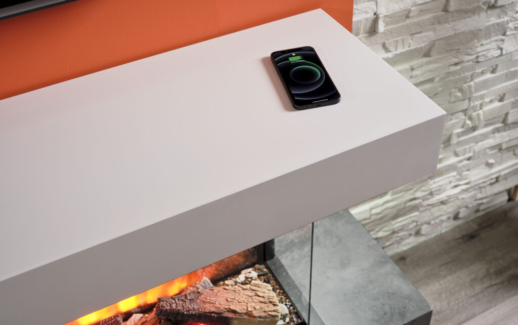 Draadloos telefoon opladen bij de meubels van E-FX Fires.