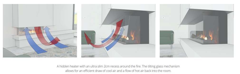 Omniglide glaseffect, een kantelbare glazen paneel dat de vlam beter tot zijn recht doet komen, het verwarmingselement is hierdoor niet zichtbaar. Omniglide creëert hierdoor een 3D-effect.